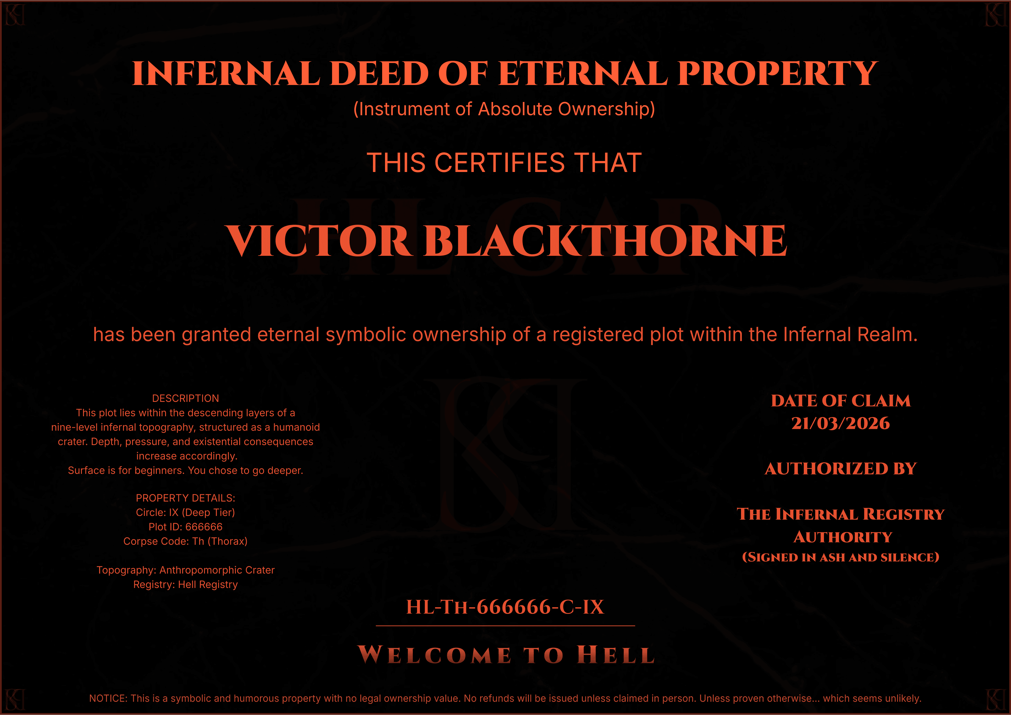 Claim your official Infernal Property Certificate